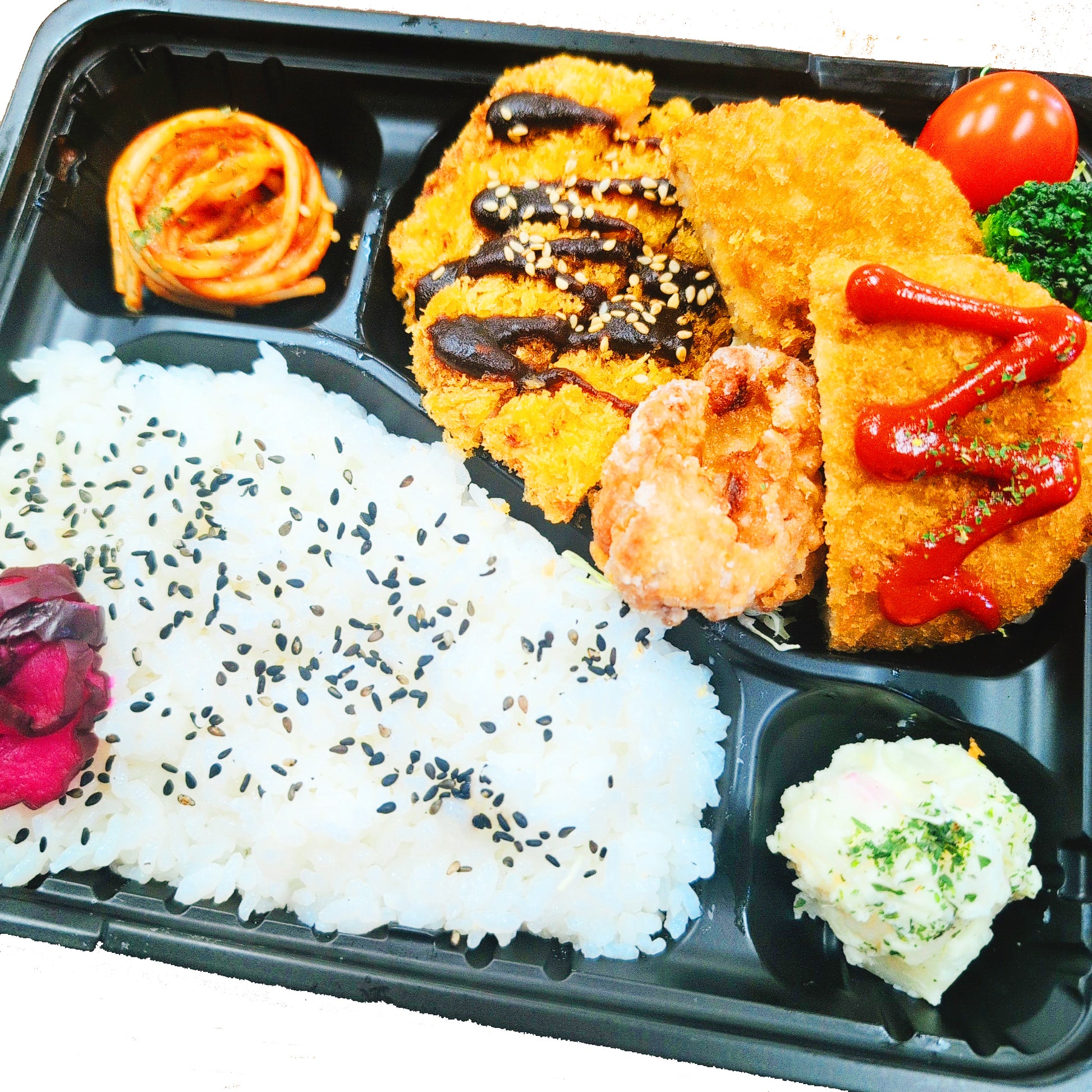 特製の自家製カツとからあげ、牛コロッケをメインに男性でもOKのボリュームに仕上げました、容器も当店で販売しているお弁当と同等のサイズでミニではありません!