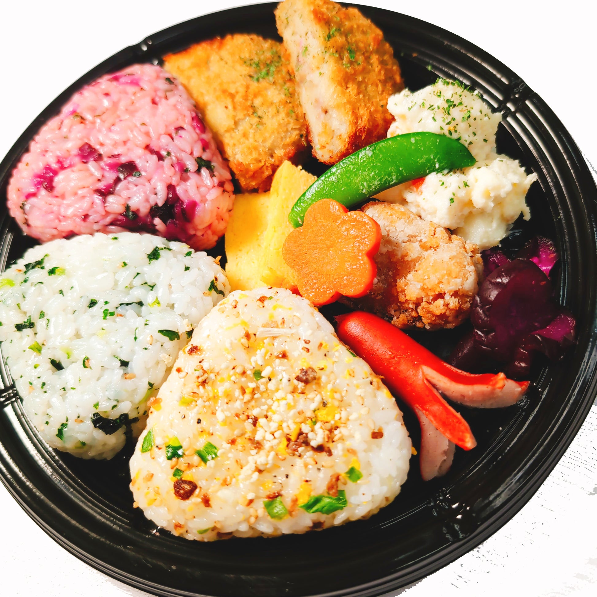 【豪華 3種のおにぎり&おかずサラダセット】3種の特製おにぎりと和風のおかず、サラダがついた人気セットです。おにぎりはチャーハンや高菜、梅、明太など季節に合わせて混ぜご飯や炊き込みご飯でお届けします。